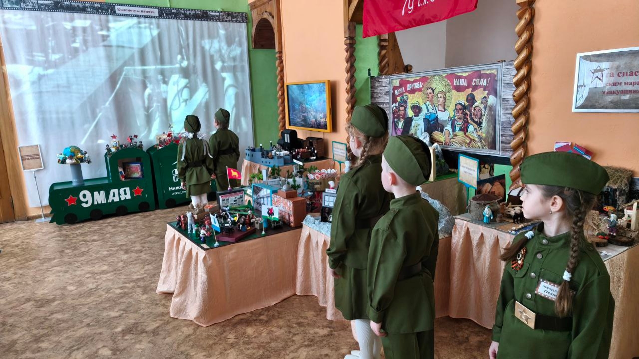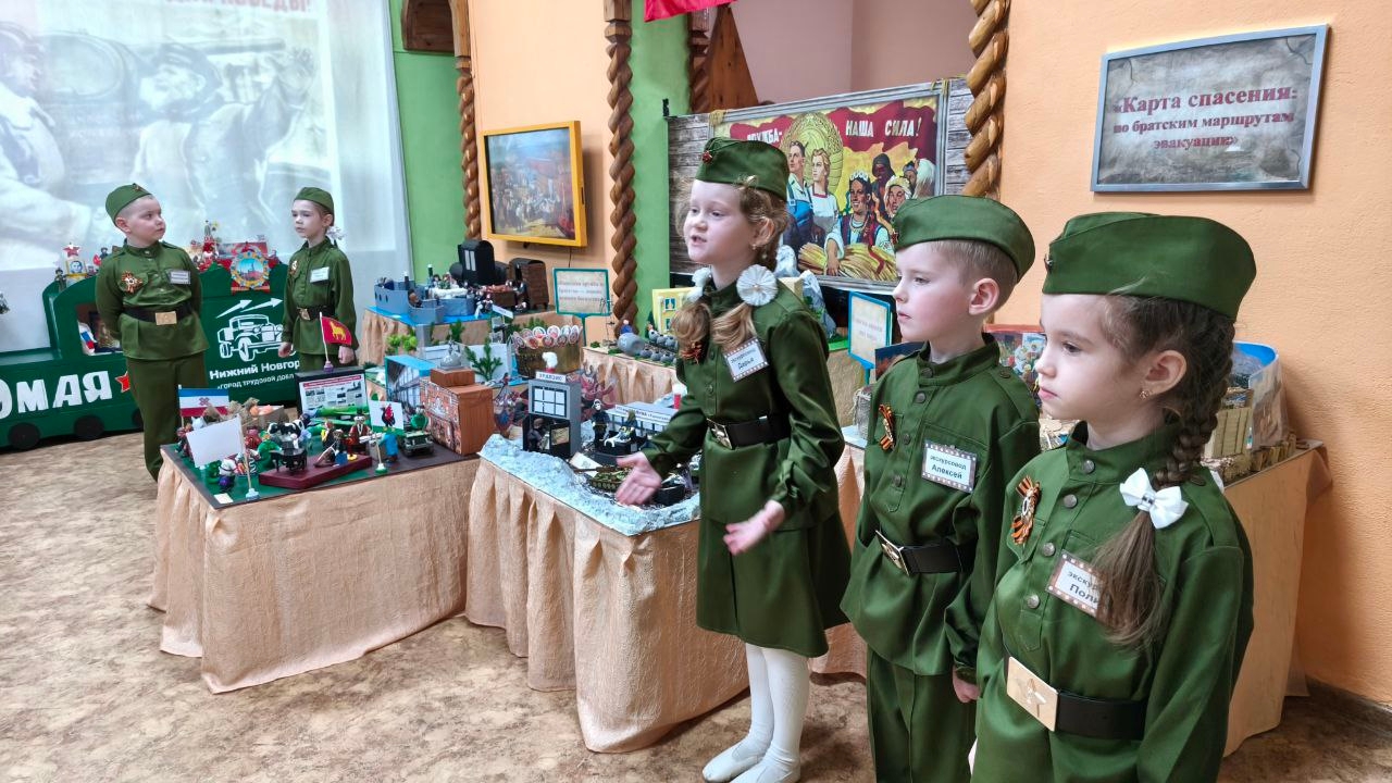 Воспитанники подготовительной группы Ольга Т., Константин К., Дарья К., Полина Б. и Алексей М. вместе с педагогом-психологом Анастасией Игоревной. представили экспозицию «Карта спасения: по братским маршрутам эвакуации». В ходе эмоциональной экскурсии оживала история. Дети говорили о войне, о дорогах, по которым спасались люди, о силе дружбы народов, о подвигах фронта и тыла. В зале стояла тишина... Та самая тишина, которая дороже любых аплодисментов. У гостей на глазах блестели слезы.